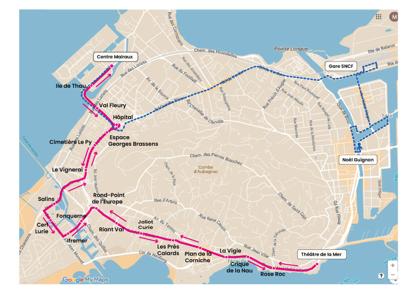 > Pour rejoindre les arrêts du bord de mer et de La Corniche : emprunter la ligne 2 jusqu’au Centre Malraux puis faire une correspondance avec la ligne 3 direction Théâtre de la Mer.